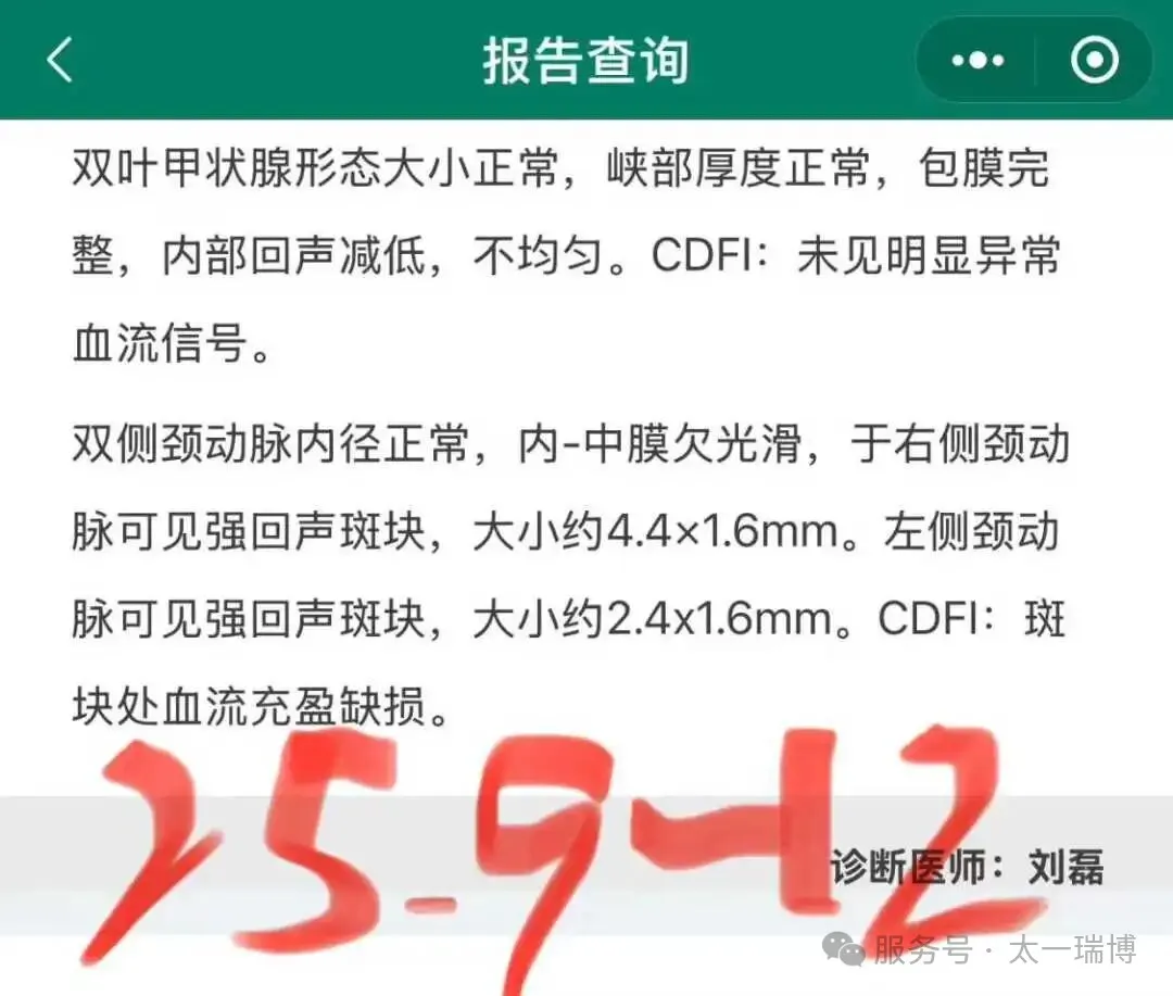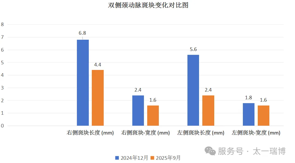 2025年9月复查 超声显示,双侧斑块不仅性质转变为更稳定的强回声斑块,尺寸更是显著缩小:右侧变为 4.4×1.6mm,左侧变为 2.4×1.6mm。