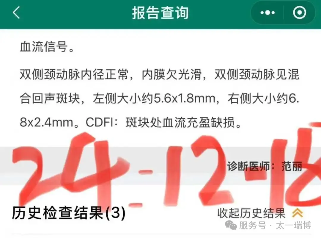 2024年12月: 超声报告显示,他的左侧有一个5.6×1.8mm的混合回声斑块,右侧颈动脉有一个6.8×2.4mm的混合回声斑块,